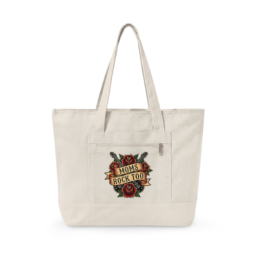 Canvas Tote Bag – "Moms Rock Too" Floral Tattoo Design, Zippered Everyday Tote